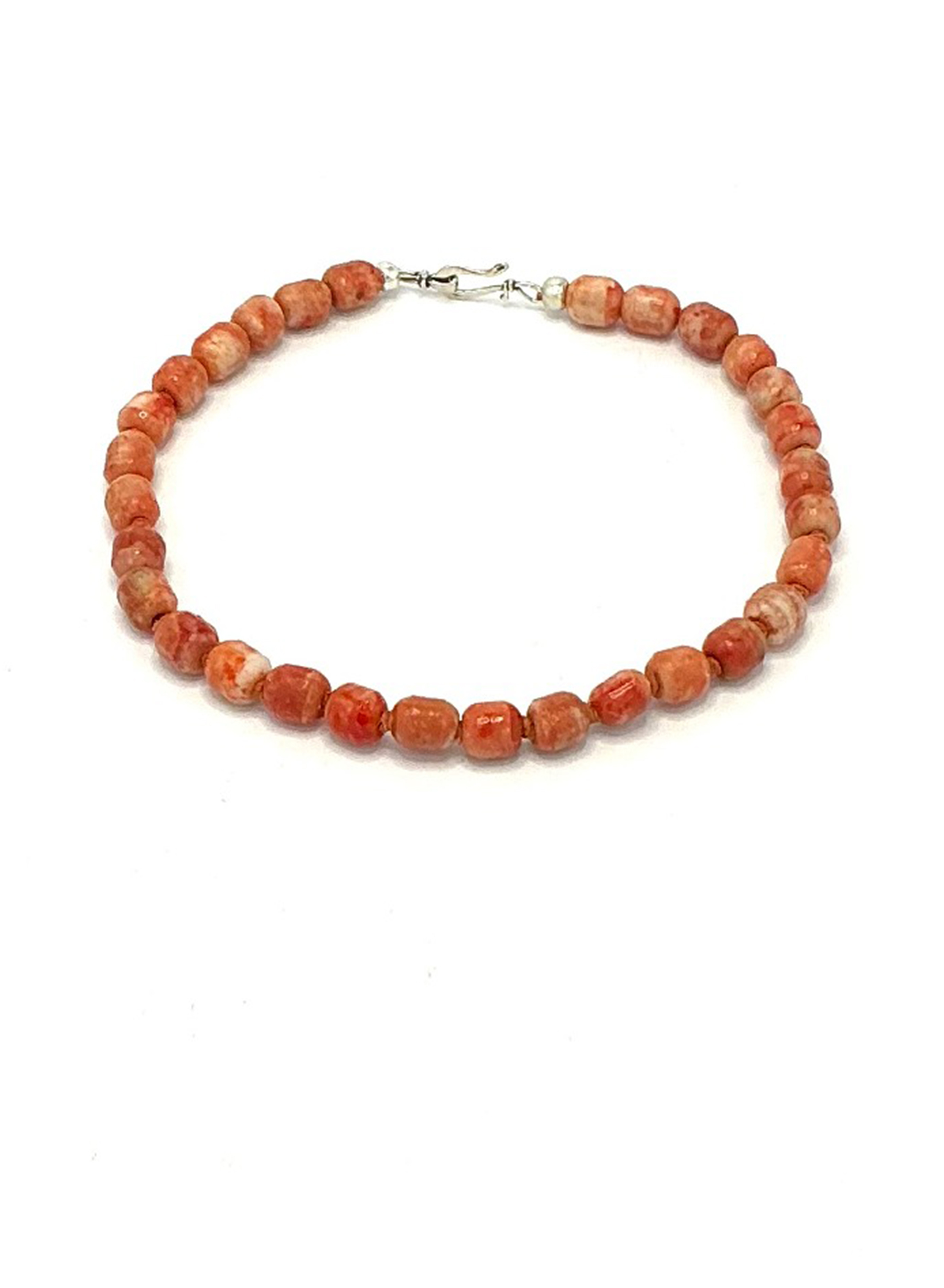 Hand knotted antique (circa 1800s) Prosser bead choker with sterling silver clasp. The English Prosser brothers patented a method in 1840 for pressing powdered ceramic or porcelain with binding agents into buttons, a technique later adapted by a Frenchman who applied the same button-press process to beadmaking, giving rise to Prosser beads. These beads are made from mixed with binding materials, then pressed in molds under heat to form durable, brightly colored beads with crisp shapes. Pair with companion piece TC-1049.