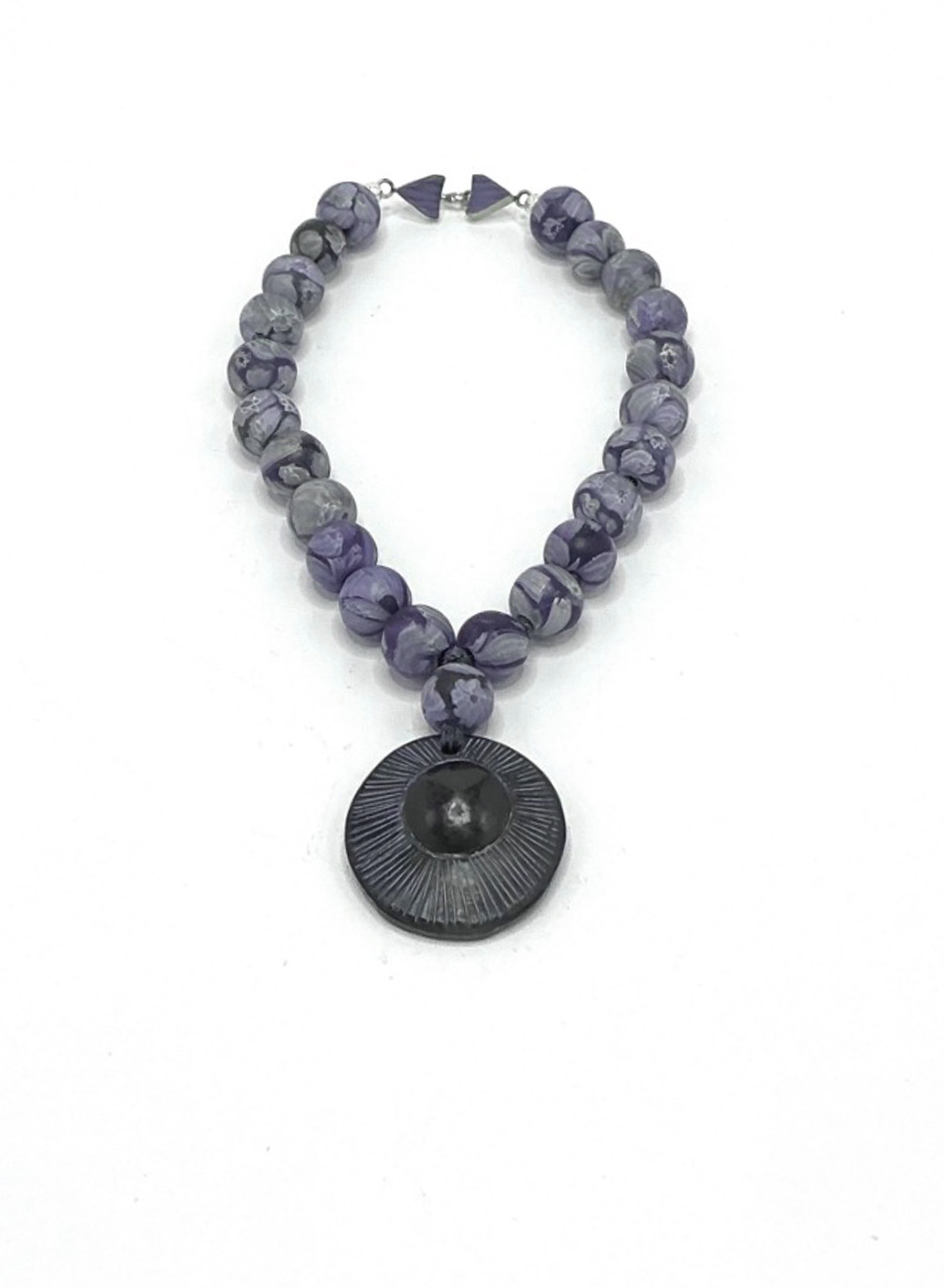 Overall Length: 17″ Double hand knotted Venetian trade beads (circa 1800) with carved artisan ceramic sunburst pendant handmade in Bulgaria..