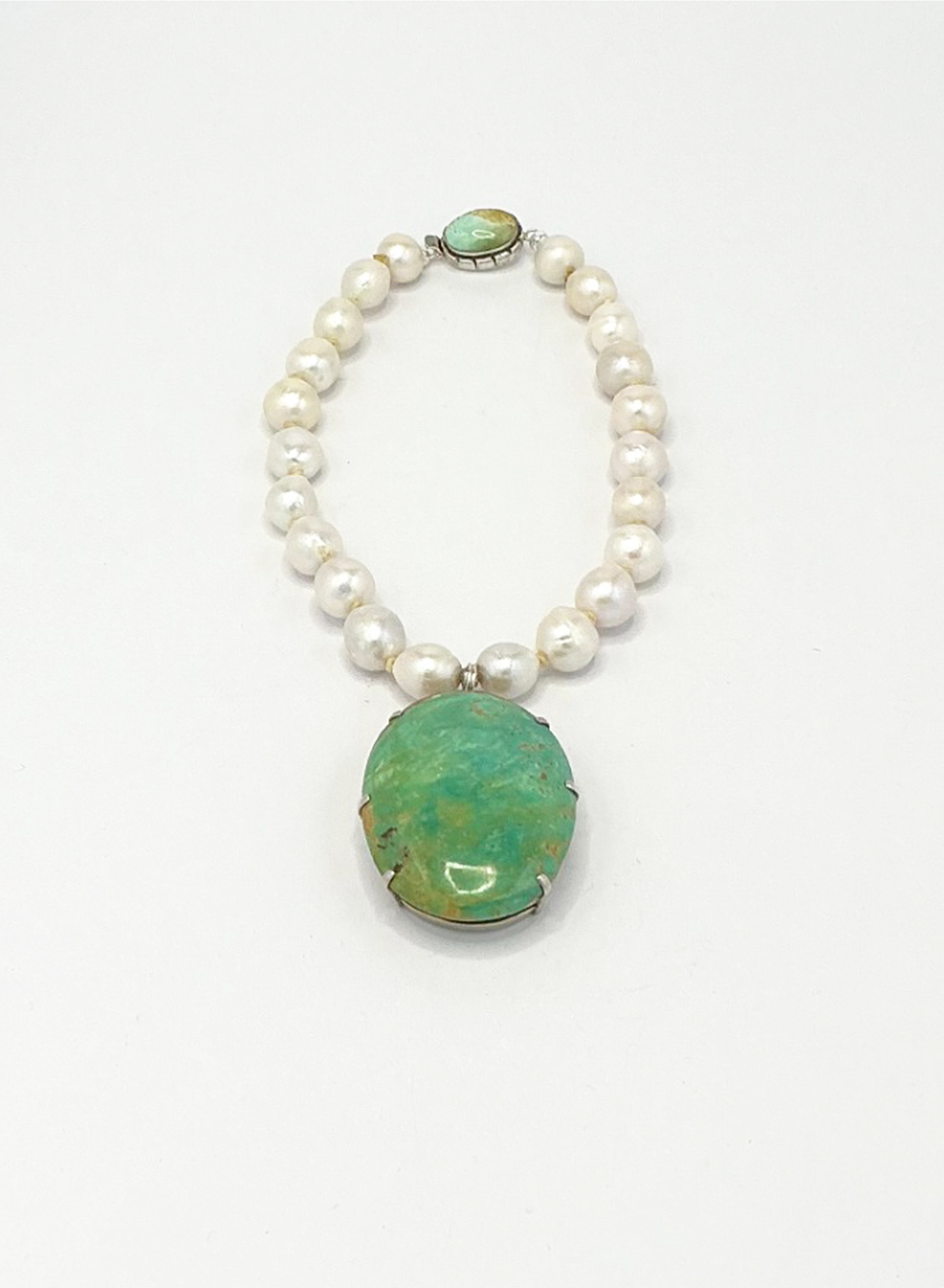 Stunning large blue moon turquoise cabochon set in a unique sterling silver design with large Baroque pearls hand knotted and finished with an artisan crafted green Royston ribbon turquoise turquoise clasp also set in sterling silver. Blue moon turquoise is relatively rare and known for its blue hues and holds much significance with Native American cultures where it is considered sacred. “Blue Moon” refers to the second full moon in a calendar moth-a rare event adding mystique.