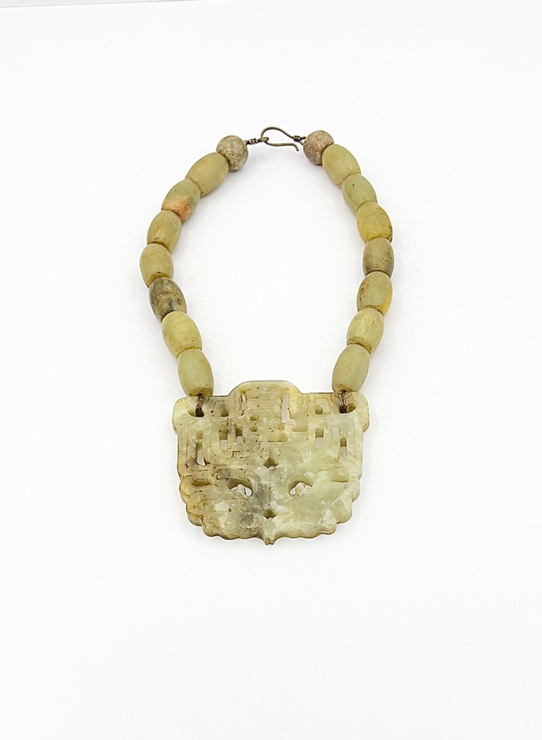 Carved Olive Opal Necklace with Carved Hetian Jade Pendant