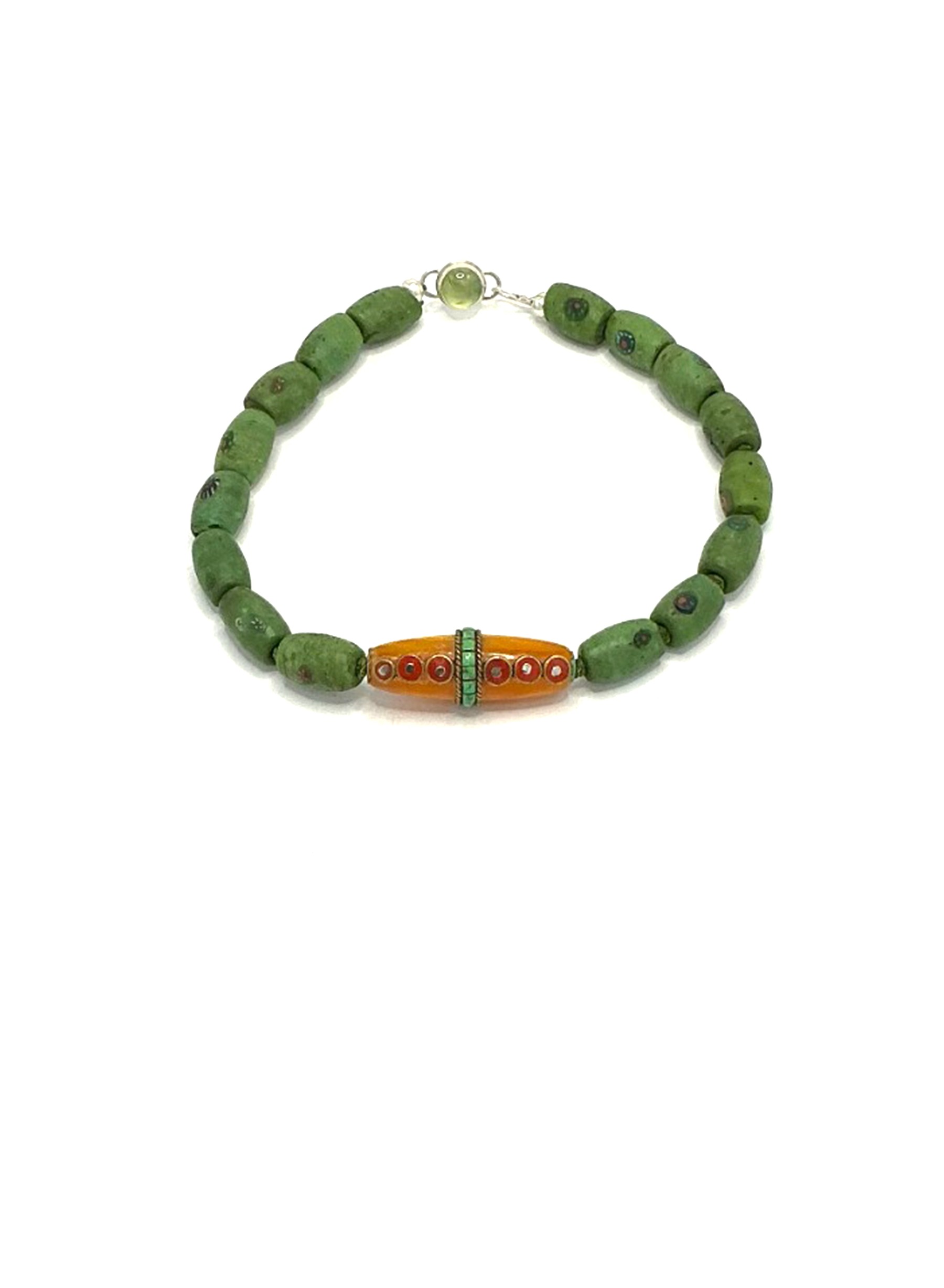 Hand knotted antique (200+ years old) glass beads made in the Millefiori style by Venetian glass guilds. The striking antique Tibetan agate with turquoise and Dzi (pronounced “Z”) inlay is a powerful protective symbol for the peoples of Himalaya and Central Asia. Pair with companion necklace GEM-2063.