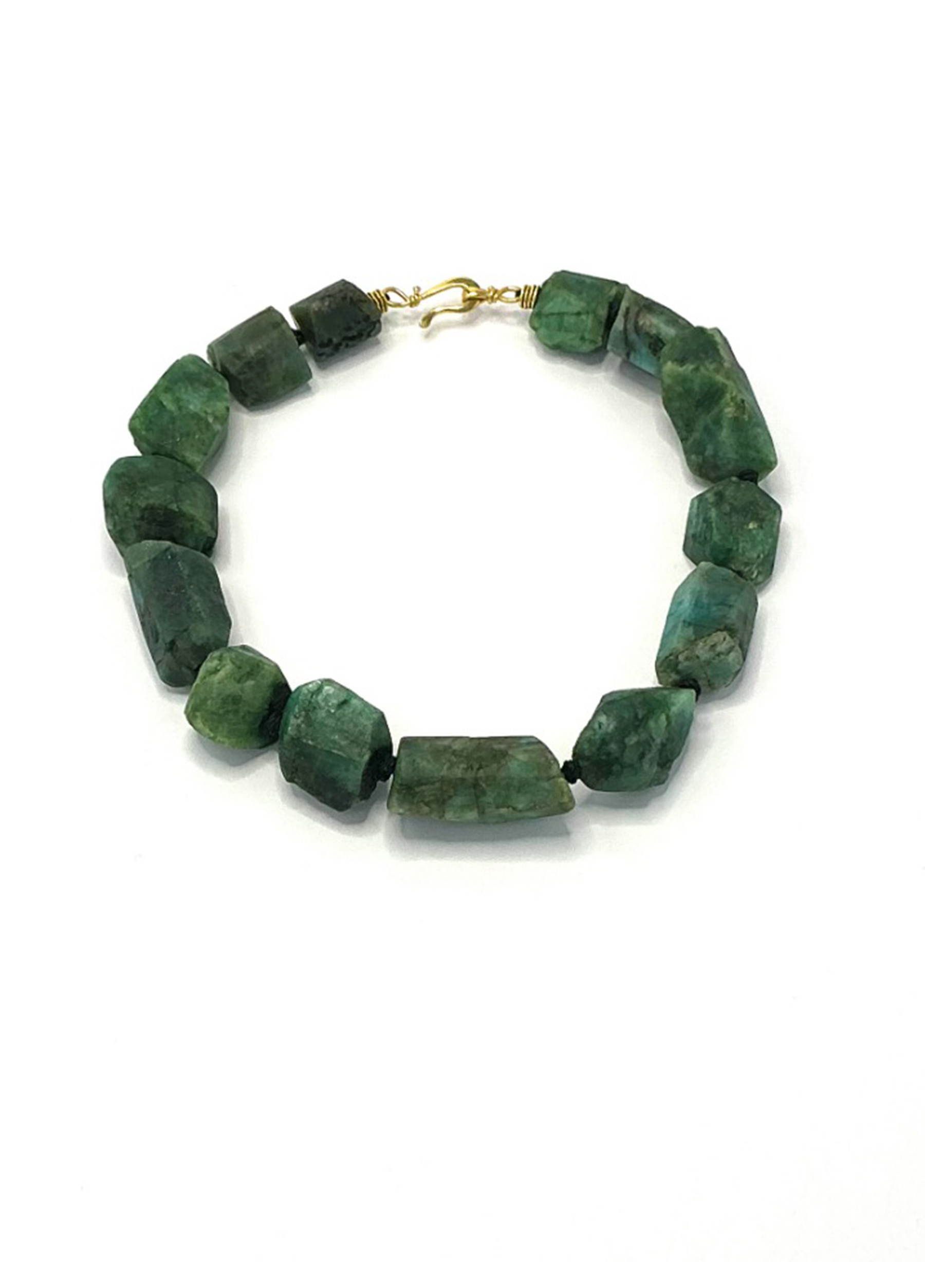 Stunning large chunk raw emeralds hand knotted in a short necklace with hand crafted gold vermeil clasp and focal beads. Raw emeralds, treasured since ancient times, are known for their deep green color and natural, uncut form, symbolizing renewal, love, and wisdom. First mined over 3,000 years ago in Egypt and revered by civilizations like the Incas, Aztecs, and Mughals, they carry rich historical and spiritual significance. Often considered more powerful in their raw state, emeralds are believed to enhance intuition, offer protection, and support emotional healing.